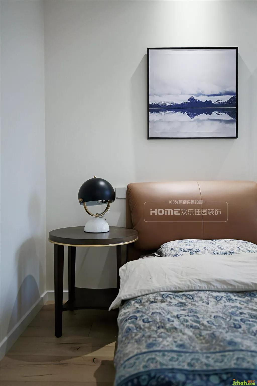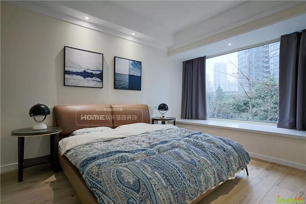 主臥精心挑選了一款棕色皮質(zhì)雙人床,輔以品質(zhì)感滿滿的印花床品,實(shí)用性和美觀性相得益彰。由于樓層不高,外面的綠植影響到室內(nèi)的采光,因而需借助大面積的飄窗和光源提升亮度。