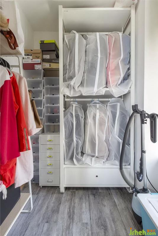 主臥里的隱藏的衣帽間+儲物間,不僅能有效的將雜物隱藏于無形,還能避免灰塵的入侵。女主非常會收納,鞋子、衣物、各種小物件,一定要把分類規(guī)整,方便拿取,還能增添生活中的小趣味。