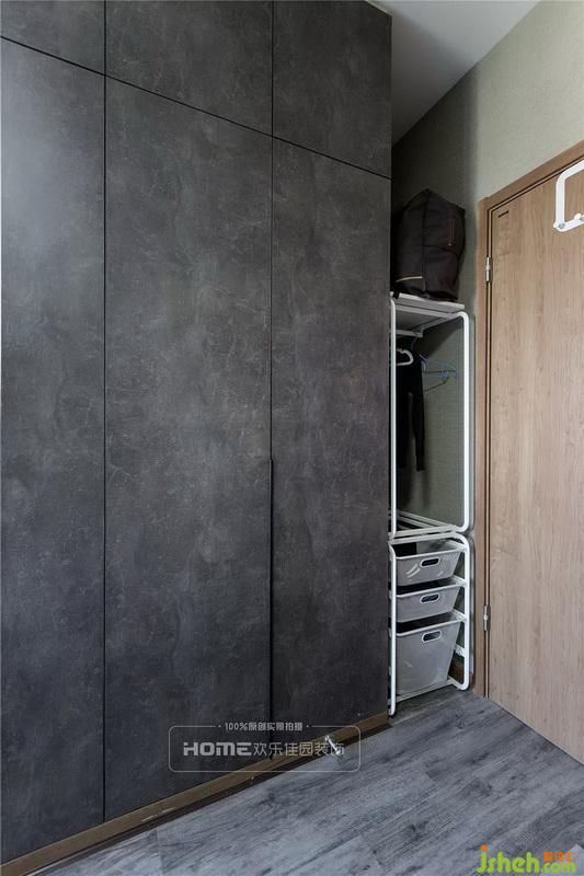室內(nèi)設(shè)計師充分利用門后的空間,作充裕的儲物區(qū)域,在墻壁與衣柜的空隙處,選擇尺寸合適的收納置物架,置放使用頻率高的物件,隨拿隨放。