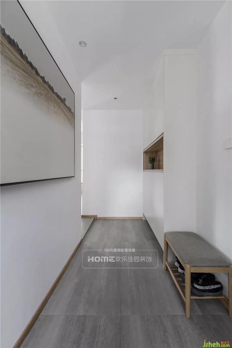由于戶型是異形結(jié)構(gòu),入戶自然形成一個(gè)緩沖區(qū)域,簡(jiǎn)單素雅的陳設(shè),加之木質(zhì)踢腳線、灰色地板平衡視覺(jué),依稀可見(jiàn)的內(nèi)里空間,有著“猶抱琵琶半遮面”的意境,透露著神秘與時(shí)尚感。