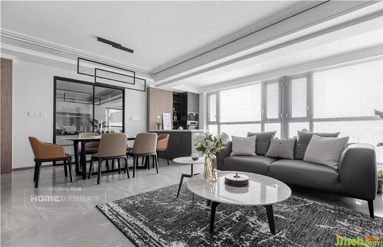 原房的客餐廳空間大,加上大面積的落地窗,空間有足夠的采光,設(shè)計師在后期的改造上把客廳陽臺納入整體空間,既保證了客餐廳的空間使用尺寸,又讓整體空間看起來大氣明亮。
