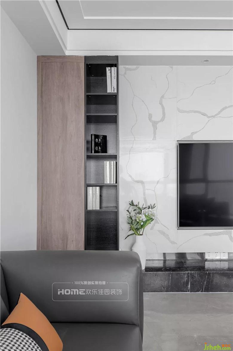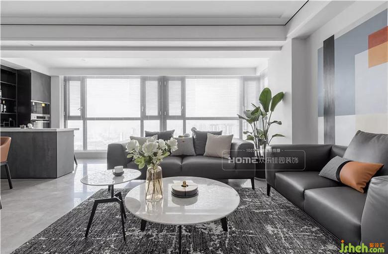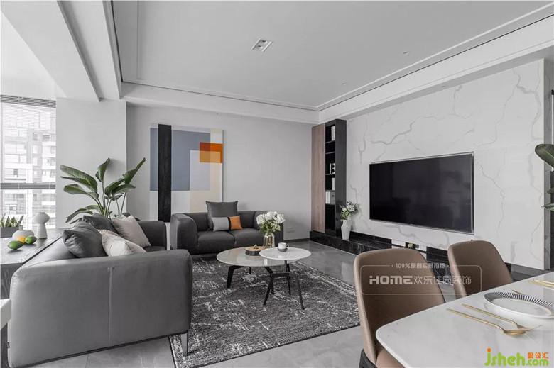 空間色彩主要以冷灰與暖灰為主,這一點符合Miss劉的審美需求;考慮到家里有老人和小孩,所以在軟裝的搭配上使用少許耀眼的橘色把色彩層次拉伸,擴充視覺感,整體空間盡顯高級又不失溫馨。