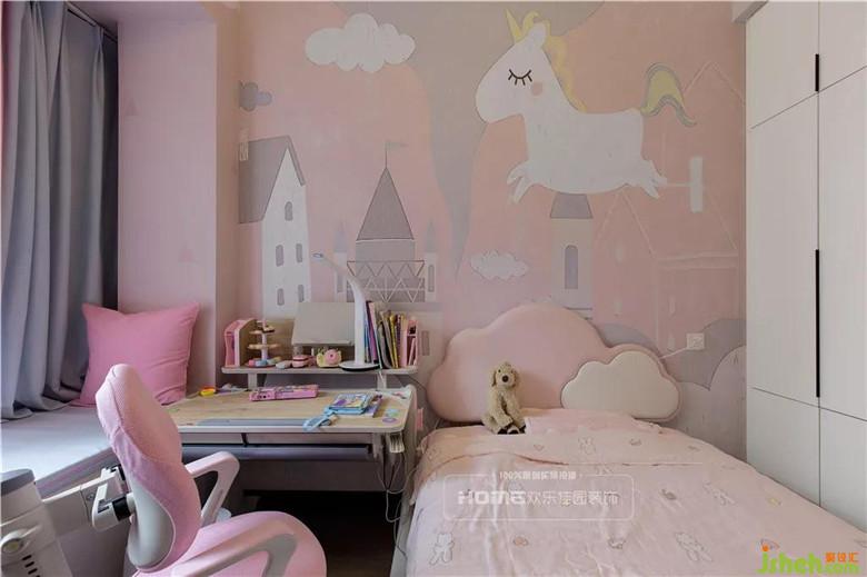 女兒房除了考慮基本的睡眠和收納功能,,在窗口光線好的地方,安排了寫作閱讀的書桌,,俏皮可愛的墻紙和粉嫩云朵床是絕配,,一盞小燈,各種玩具讓夜晚更加溫馨。