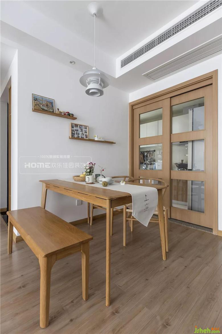 一盞吊燈保證基礎(chǔ)的照明,白色的燈,木色的餐桌椅,同色系的隔板,擺上照片合集、裝飾擺件,別致的溫暖,讓家回歸煙火氣息。
