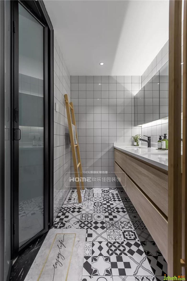 原房兩個衛(wèi)生間是緊挨著的,打通其中一個衛(wèi)生間的隔墻,劃分為獨(dú)立的洗漱區(qū)域,用復(fù)古的白磚與不規(guī)則圖案的花磚鋪貼墻面與地面,竹制的鏤空隔斷,半透明的效果,給空間增添一絲清幽感。