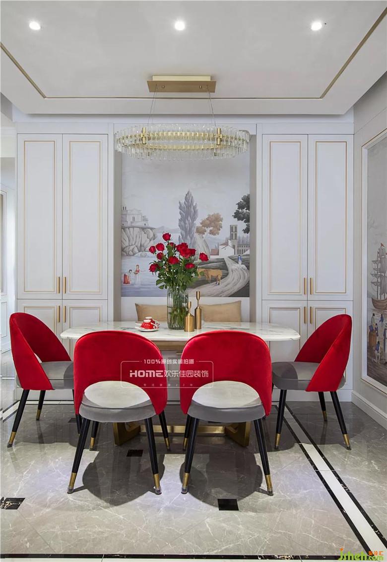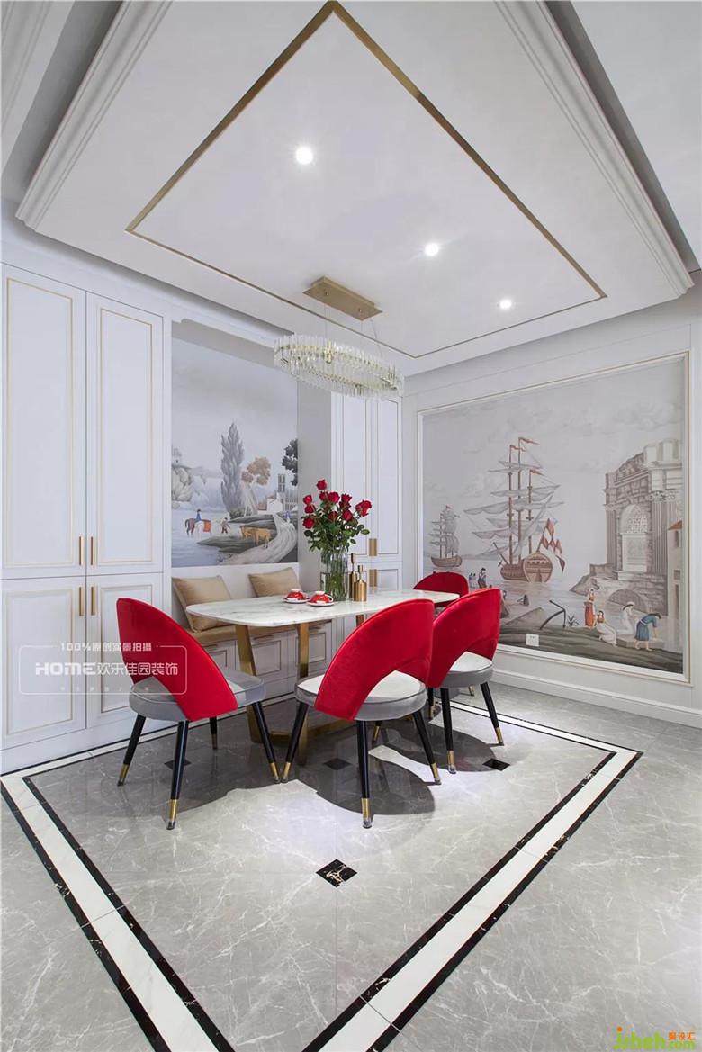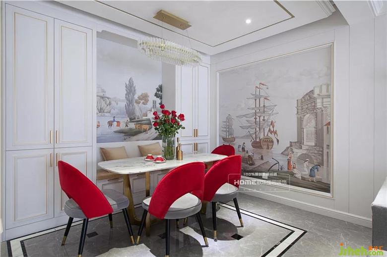 餐廳是卡座的形式,大面的白色用紅色餐椅點綴,墻面上是異域風格墻畫,用餐氛圍時尚活躍,是一家人交流的好地方。