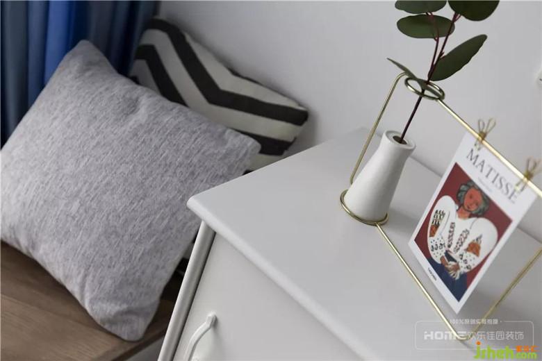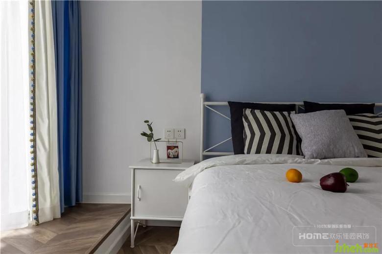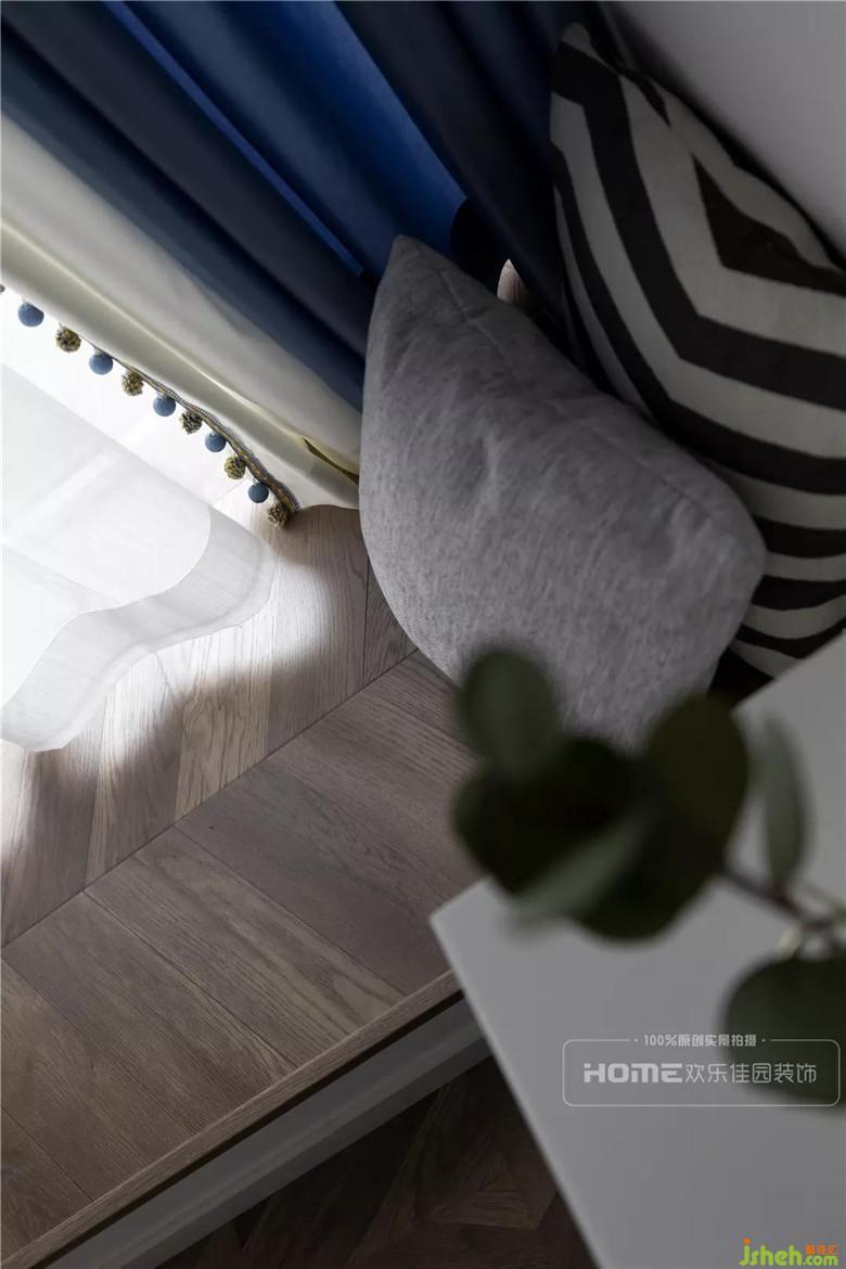 次臥有設(shè)計(jì)感的墻面分色,制造視覺(jué)焦點(diǎn),一邊藍(lán)、一邊白,靈動(dòng)又自然,不規(guī)則、不對(duì)稱,方能表達(dá)出不刻意的隨性;魚(yú)骨拼矮飄窗,貫穿整個(gè)家居空間,在第一縷暖陽(yáng)中睜開(kāi)惺忪的睡眼,流動(dòng)的線條引領(lǐng)著美好的開(kāi)端。