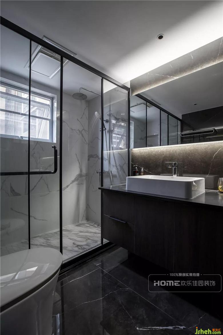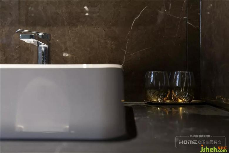 主衛(wèi)生間淋浴區(qū)與洗漱區(qū)用深淺色彩劃分,洗漱區(qū)深色墻地磚結(jié)合黑色大理石臺(tái)面,時(shí)尚簡(jiǎn)約中流露出個(gè)性與獨(dú)特。
