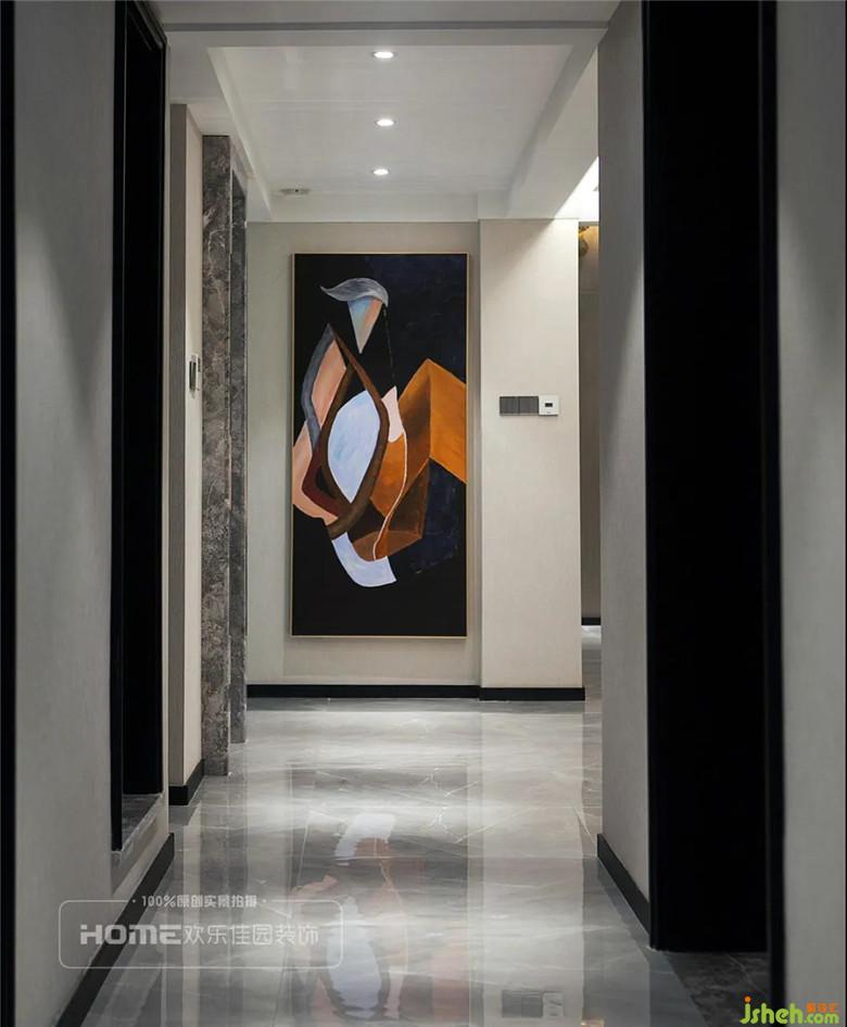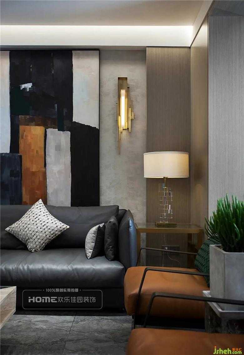 電視背景大尺度的連紋石材與周圍暖灰色的墻板形成材質(zhì)的對(duì)比,同時(shí)又相互呼應(yīng),硬朗的石材和質(zhì)軟的墻板結(jié)合的恰到好處。沙發(fā)背景時(shí)尚的現(xiàn)代裝飾畫是女主人的親筆畫作,在空間中有極高的融合度和氣質(zhì)感。