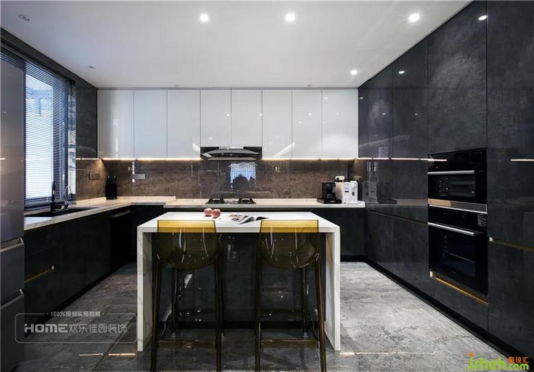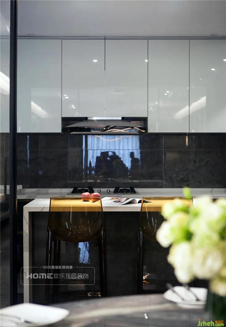廚房在考慮充足的功能及儲(chǔ)物外,色彩與材質(zhì)的搭配選用也是清新時(shí)尚的, 光滑透亮的烤漆材質(zhì)做櫥柜,吧臺(tái)搭配了與簡(jiǎn)約風(fēng)格無(wú)比契合的幽靈椅,體現(xiàn)主人對(duì)美好時(shí)尚生活的追求。