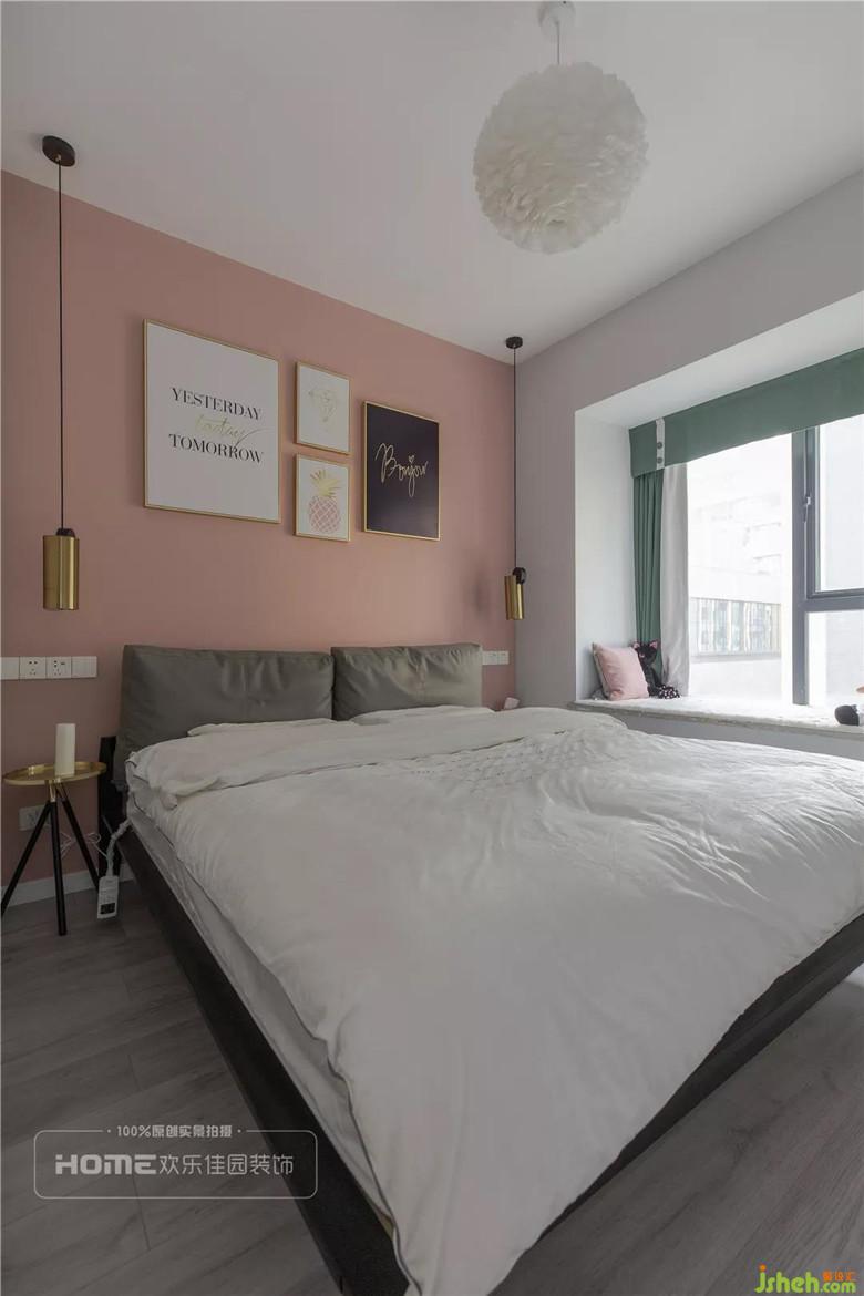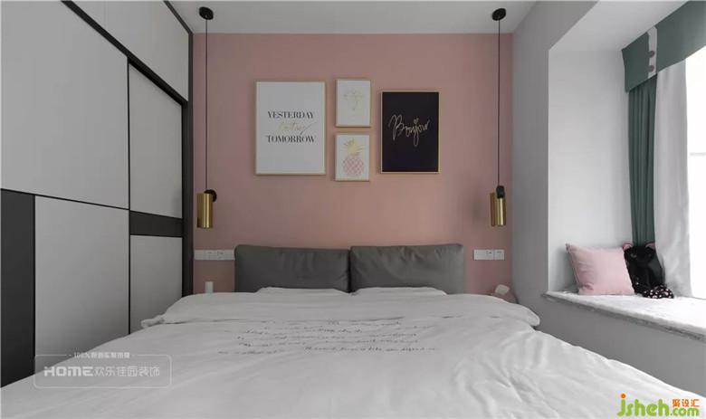 根據(jù)女主人的喜好,主臥背景刷上粉色乳膠漆,搭配金屬框裝飾畫和床頭燈,營造出溫暖舒適的環(huán)境,飄窗設(shè)計(jì)更大限度的提亮室內(nèi)光線,微風(fēng)幾許,歲月靜好。