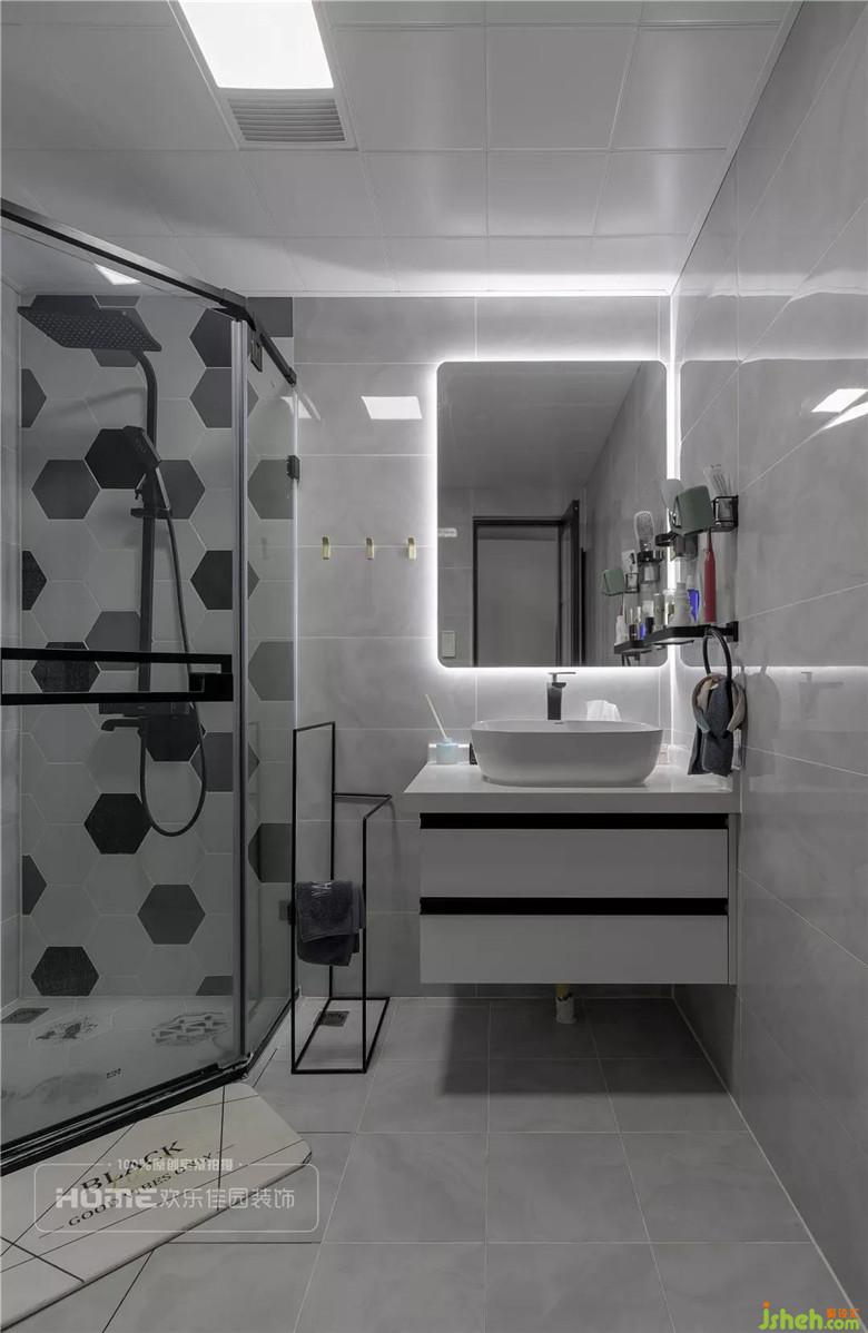 撞色六角磚拼接成墻上一道獨(dú)特的景象,使用玻璃門有效的將洗漱淋浴分開,充分利用置物架、浴室柜小家具收納衛(wèi)生間用品,看起來雜而不亂。