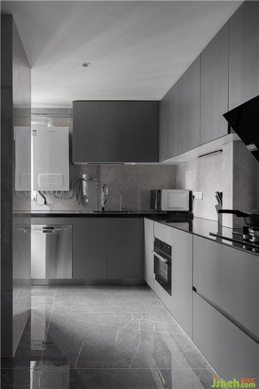 在不同人的家里,廚房看起來(lái)幾乎是最沒有什么新穎的地方,櫥柜+油煙機(jī)+灶具+水槽的黃金搭配,每家都差不多。但設(shè)計(jì)師根據(jù)屋主的身高,設(shè)計(jì)了高低臺(tái)櫥柜,更符合日常的使用習(xí)慣。淺灰墻面大理石瓷磚搭配深灰色的素色柜體,把高級(jí)灰體現(xiàn)的淋漓盡致;通透玻璃將空間感延伸。