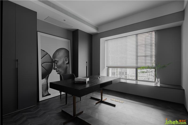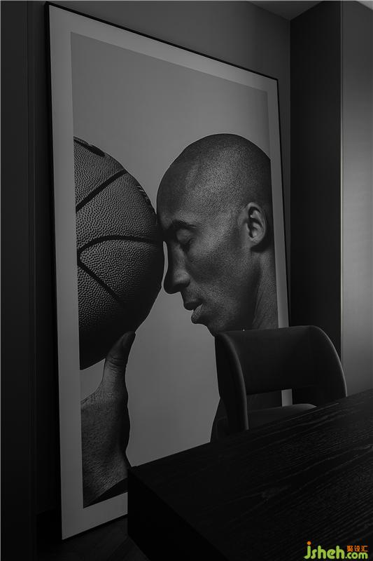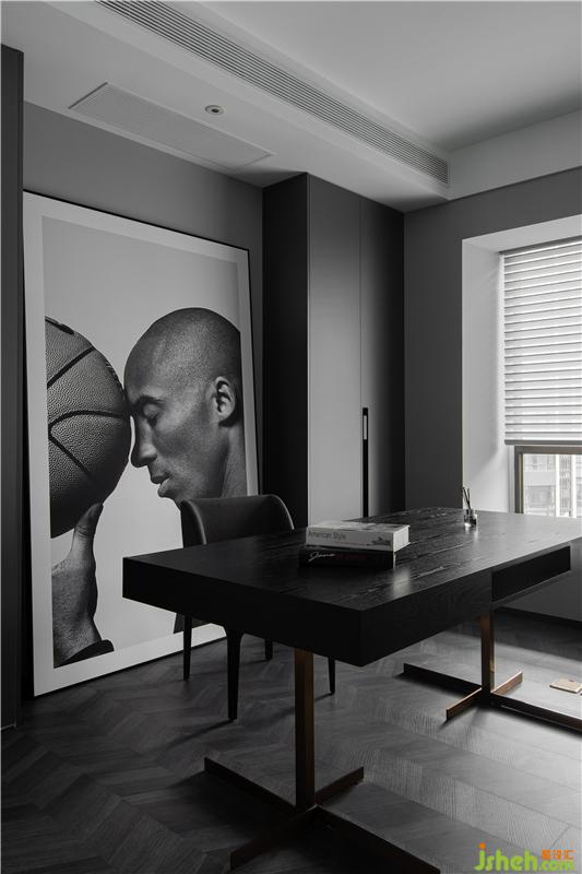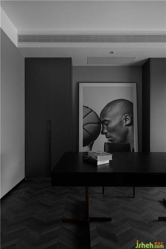 書房的主背景兩邊設(shè)計(jì)了通頂書柜,滿足屋主足夠的收納儲(chǔ)物空間;在書柜中間留空放一幅科比的寫真噴繪,表達(dá)屋主對(duì)偶像的極致喜愛。中間一張極簡(jiǎn)書桌,既體現(xiàn)了業(yè)主的審美和愛好。