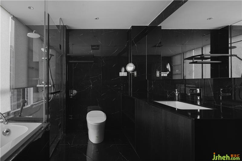 黑色的大理石瓷磚和極簡(jiǎn)淋浴房把高級(jí)感和精致感做到了完美的演繹,四分離的布局讓功能做到了極致??看傲茉》亢驮「?,讓人在放松的時(shí)候也有了對(duì)外的空間聯(lián)想。