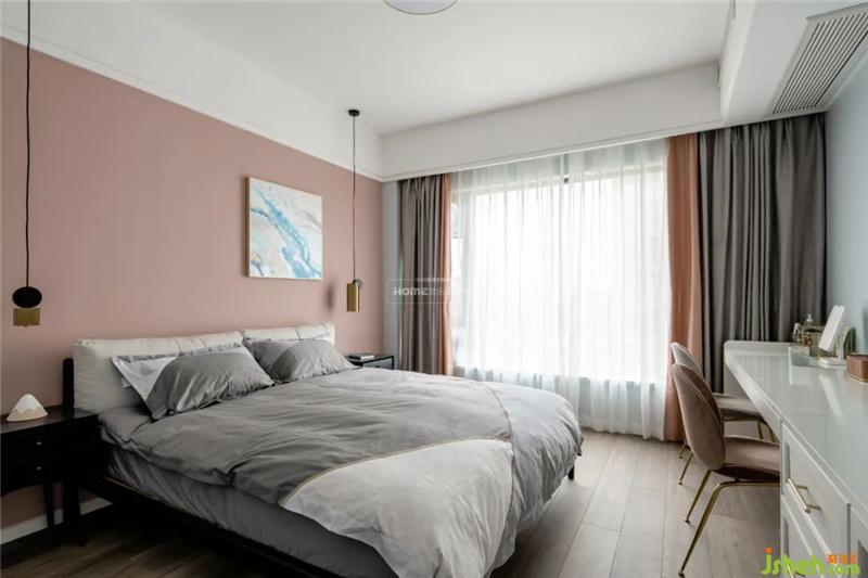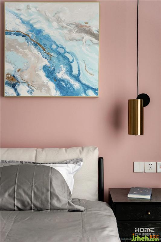 主臥室床頭采用粉色黑板漆,與墻面灰藍色乳膠漆形成色彩對比,床頭采用金色獨立吊燈,家居設計增加空間燈光層次以及精致度。