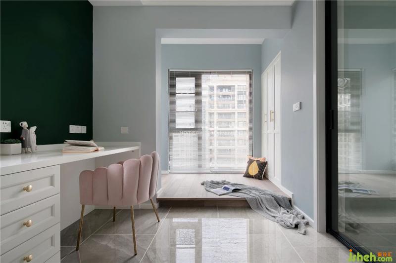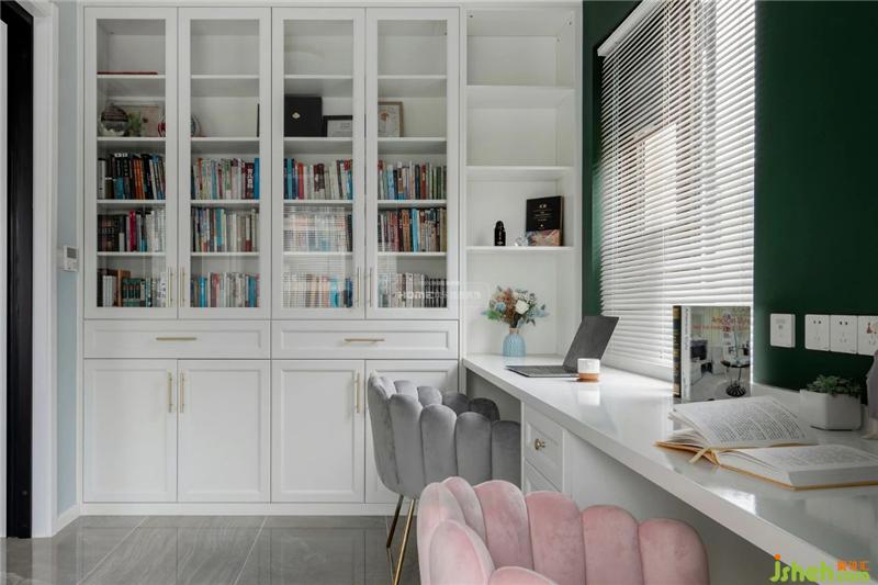 雙人書桌前墻面采用綠色墻面,既能緩解工作學習時候的視覺疲勞,也讓空間色彩層次更豐富。