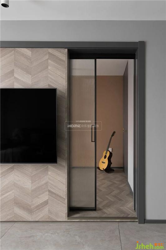 客廳與多功能活動室空間即相連又各為兩個獨立的空間,電視墻與多功能活動室的共用墻面采用魚骨拼地板上墻,與隱藏的長虹玻璃門形成材質(zhì)碰撞。