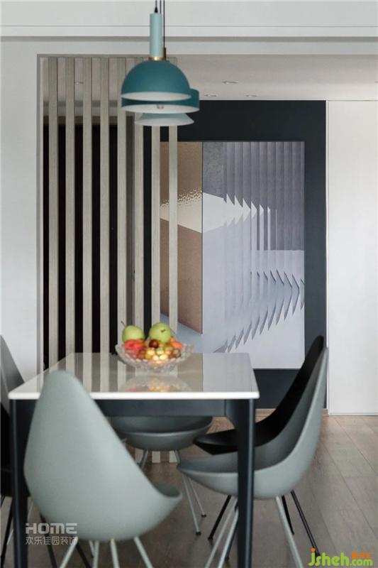 餐廳空間延伸了客廳的寬敞明亮,淡抹綠的餐椅映襯吊燈的顏色。家居設(shè)計(jì)豐富了空間色彩的層次感。設(shè)計(jì)師在餐廳增加了一組高柜加操作臺(tái),滿足客戶的烹飪需求。