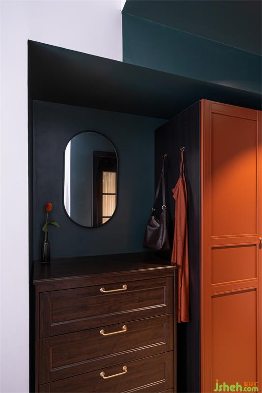 臥室中用赤紅色的內(nèi)嵌衣柜搭配深墨綠色的墻面,帶著時代的印記而不沉悶。摒傳統(tǒng)設(shè)計,在張力十足的線條勾勒、層次豐富的材質(zhì)運用以及極具質(zhì)感的裝飾細(xì)節(jié)下,為居住者帶來一種奢雅的生活享受。