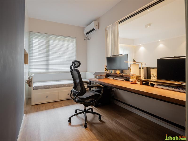 將書房與客廳中間的隔墻改為半高的透明玻璃隔斷墻,讓空間的互動性更強。透明的玻璃隔斷墻主要目的是將光線收集,并柔和的釋放到書房。增加空間采光的同時也讓書房氛圍靈動不沉悶!成為兩個人獨處空間,在這里工作效率也會提高很多倍吧!
