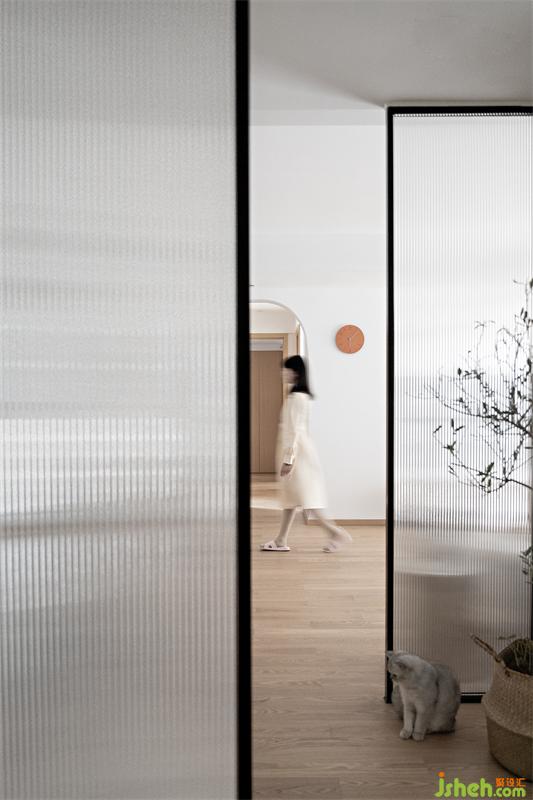 成都裝修設計材質的選擇上采用石膏板點配點光源貫穿整個空間塑型,公共空間墻面大面積使用乳膠漆進行涂飾,白色墻面在暖光下墻面顯得格外生動,猶如絲帶在起舞;