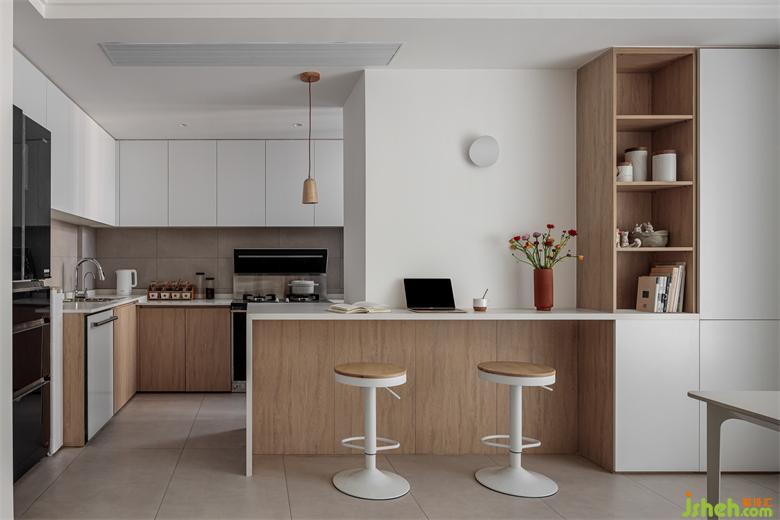吧臺(tái)把客餐廳和廚房隔開,借由流通空間的設(shè)計(jì)觀念,傳達(dá)出現(xiàn)代設(shè)計(jì)的開放性。家裝設(shè)計(jì)專屬空間明確了各自的使用功能,原木配飾與白色空間打扮出房屋的精致與華麗。