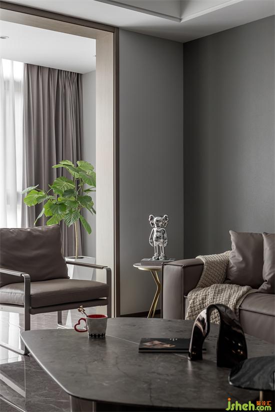 客廳采用無主燈設(shè)計(jì),避免用吊燈會(huì)使空間感壓抑,墻面使用藝術(shù)涂料,增強(qiáng)空間高級(jí)感。
