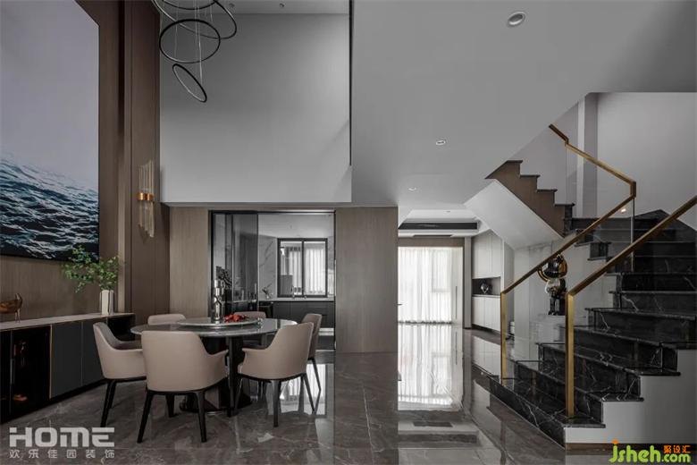 餐廳保留原有的挑高空間,增加視線感和空間感。別墅設(shè)計(jì)“空”出的餐廚廳空間呈開放式布局。與客廳形成連貫的洄游動(dòng)線,讓家人有更多共處的時(shí)間。
