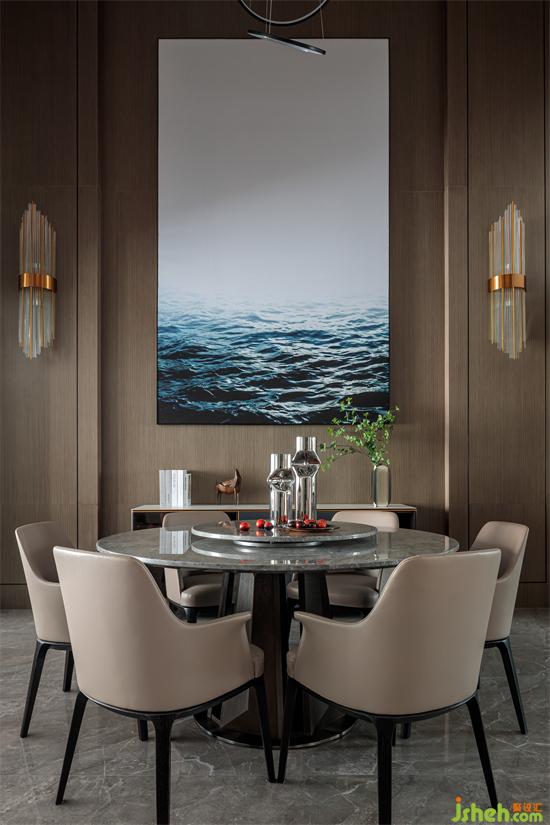 將近6米的挑高空間,量身定做的巨幅裝飾畫,畫上方大量留白,與整體深色空間相呼應(yīng)。