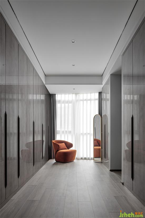 經(jīng)過二次改造將次臥室改造為現(xiàn)在的衣帽間和衛(wèi)生間一體,隱形門的設(shè)計(jì)增加臥室與衣帽間的整體性。別墅設(shè)計(jì)雙排衣柜滿足日常儲(chǔ)物功能。
