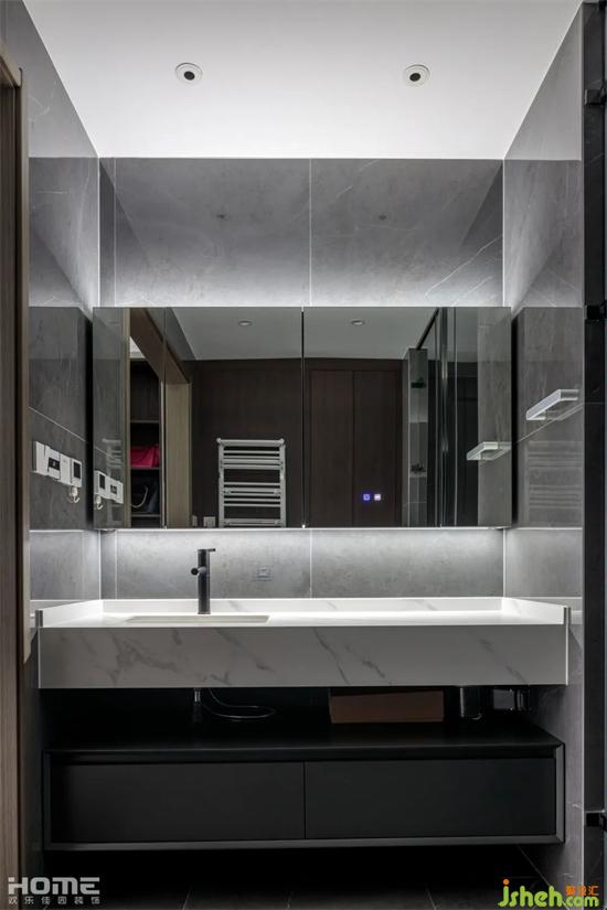 衛(wèi)生間與衣帽間相連通,增加空間的延伸感。http://m.shsyled.com/plus/list.php?channelid=18&tid=80&jiazhuang=3000&nativeplace=0洗漱臺用鏡子拉通,后面為儲物空間,滿足日常需求的同時又增強空間畫面。