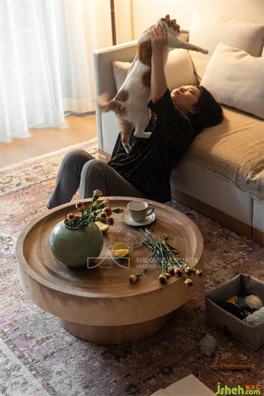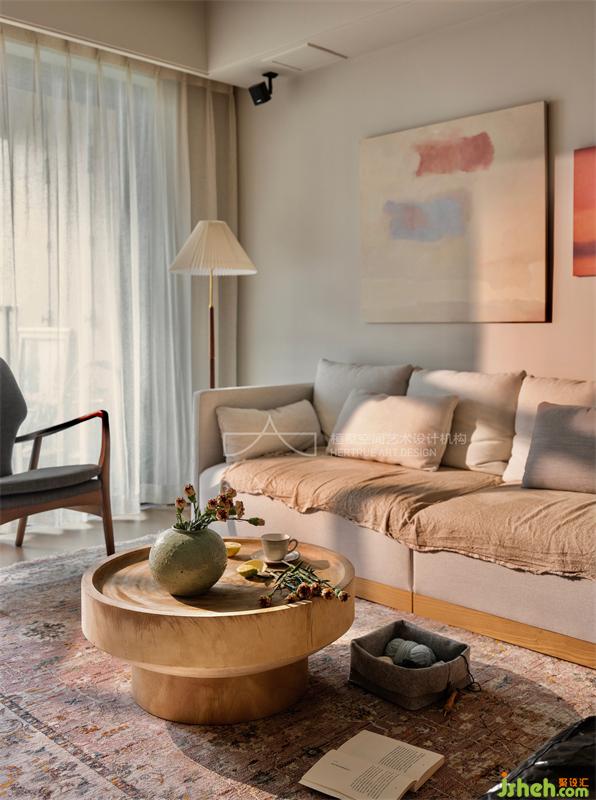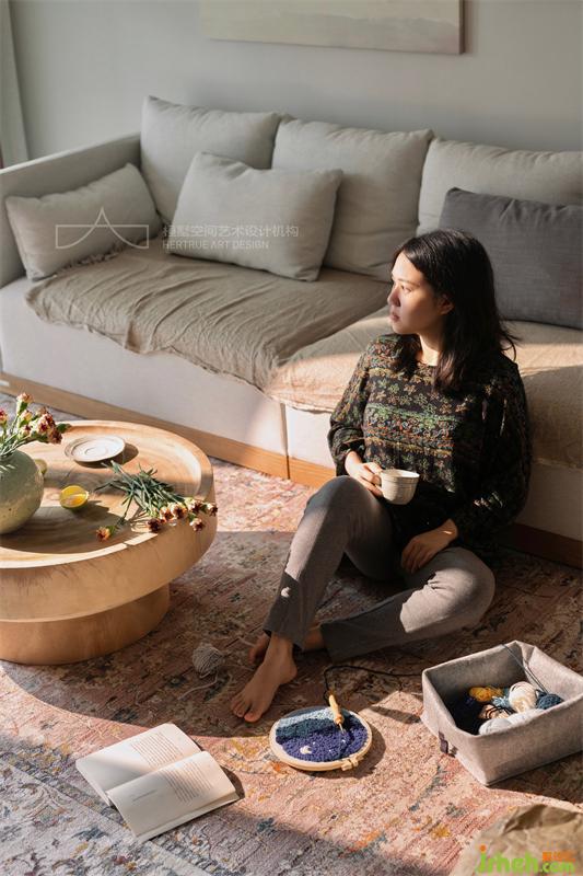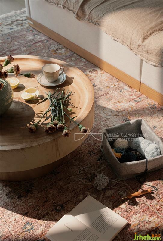 陽光透過紗幔灑向室內(nèi),為生活留下自在隨性的痕跡。干凈柔和的墻面,紋理隨意的實木家具,麻布呈現(xiàn)出自然的褶皺,讀到一半的書,放在地毯上的織物,和還未插完的鮮花...