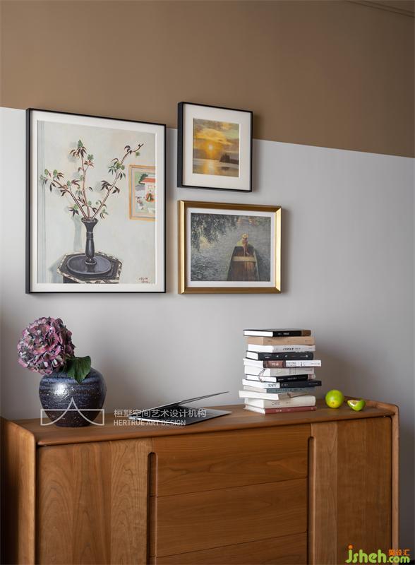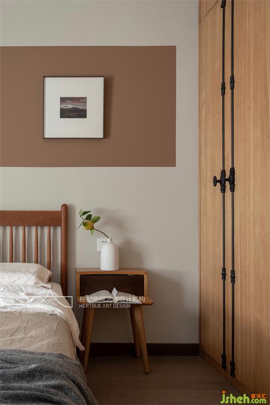 依舊是純粹的自然元素,裝飾畫刻意留白,宣紙臺燈的光線柔美而溫馨,天地鎖和實(shí)木衣柜的匹配,增添了一絲復(fù)古感。