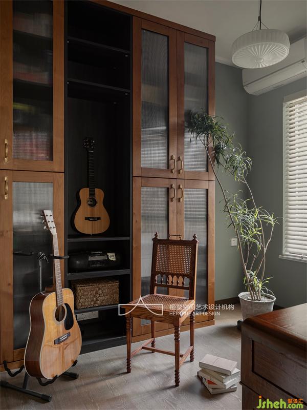 書桌是小時候就在用的老家具,承載著童年的美好回憶,重慶家居設(shè)計(jì)這次新家裝修特意搬了過來,書柜的配色便是參考書桌的感覺來的,非洲柚木,黃銅拉手,細(xì)管長虹玻璃,濃郁的復(fù)古味兒,封閉和開放形式相結(jié)合,玻璃元素的參與讓它有了通透感。