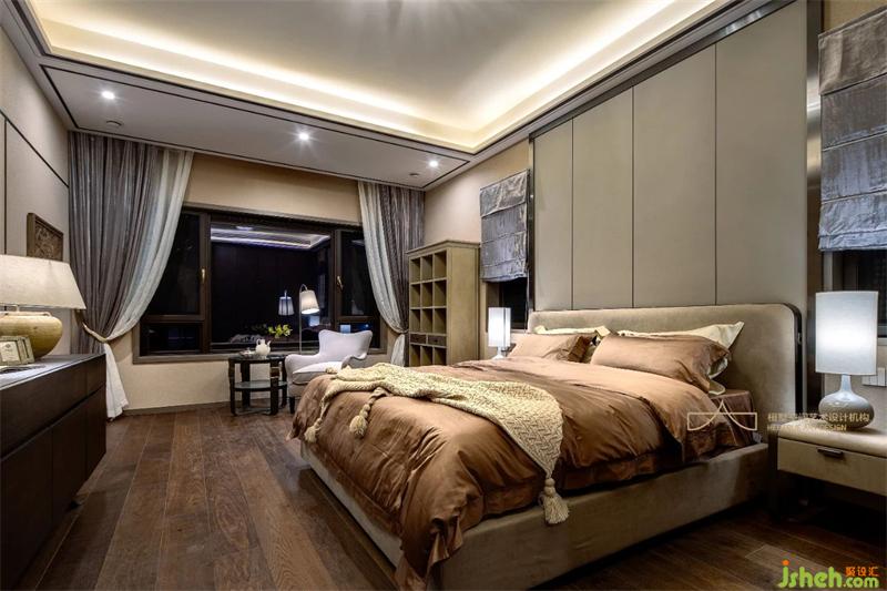 Master bedroom, shallow adjustment texture big space lay out to have a touch of gray orange tone of romantic warmth.