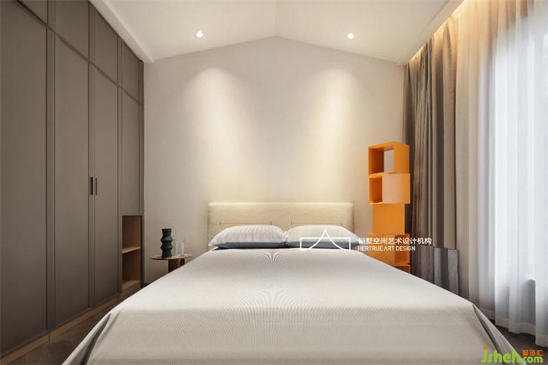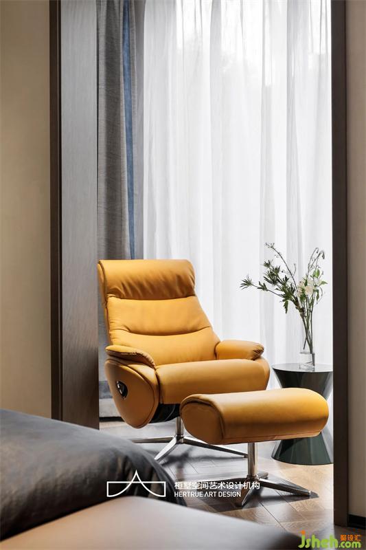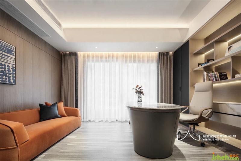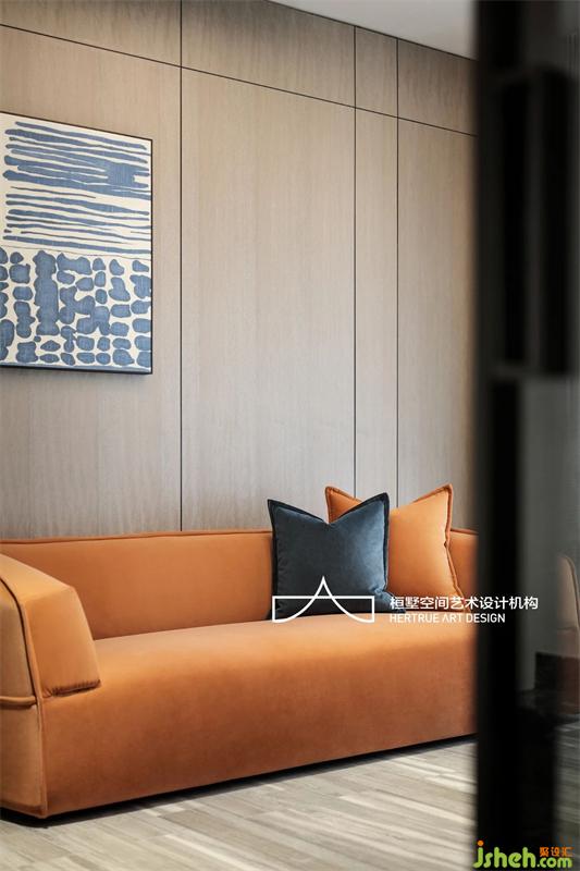 來到家庭成員私人區(qū),首先是兒子的書房,故意打開的空間,讓過道與書房借用,形成空間氣度,自然質(zhì)感的木與巖板中性色系質(zhì)感里,那一抹暖橙是空間的貫穿呼應(yīng)。