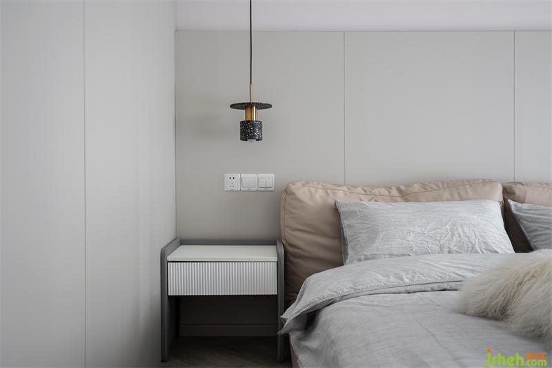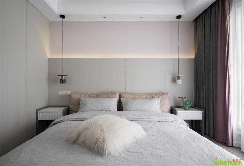 主臥室以女主人喜愛(ài)的粉色為主,搭配卡其色雙人床,一切都是舒適靜好的模樣。一抹落日余暉般的暖黃色光影被定格在素淺的墻面上,似是為每一個(gè)氤氳的夜晚增添一份暖心又浪漫的調(diào)和劑。
