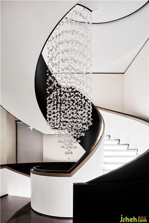 吊燈運(yùn)用金屬為主要的材質(zhì),配上黑色大理石的紋理作為呼應(yīng)。溫州售樓處設(shè)計(jì)整體提升了空間的品質(zhì)感和層次感。