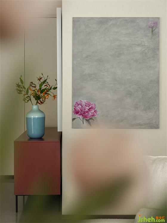 進(jìn)入從規(guī)范的現(xiàn)代主義電梯廳進(jìn)入,大紅色玄關(guān)柜搭配藝術(shù)畫作瞬間點(diǎn)亮眼前的空間,轉(zhuǎn)角墻面懸掛葉方的《虛實(shí)之間》,藝術(shù)品對情緒完成了一次微小而精妙的撞擊,它意味著你已步入全新的世界。