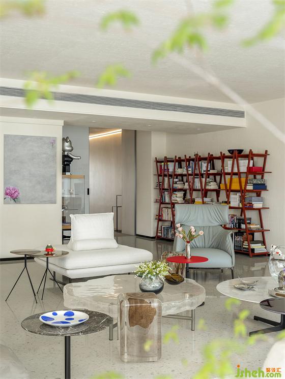 由Ligne Roset和Edra北極熊沙發(fā)圍合的客廳區(qū)潔凈而夢幻,角落的一只Foscarini Orbital落地?zé)艉豌紤械腗oroso花瓣椅將場景代入夏加爾紛繁的想象之地。易使用的大小各異的茶幾由不同材質(zhì)在內(nèi)部奏響靈動(dòng)的曲調(diào),沒有任何一個(gè)角落是沉悶呆板的。