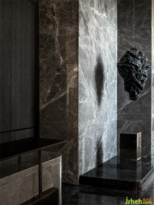 進(jìn)入售樓處空間,沉穩(wěn)的紳士灰調(diào)貫穿了整個(gè)空間。藝術(shù)中心設(shè)計(jì)簡(jiǎn)明有序的功能分布通過(guò)設(shè)計(jì)構(gòu)成方式自然過(guò)渡,又被肌理與色彩語(yǔ)言統(tǒng)一起來(lái),形成一個(gè)富于魅力的整體開(kāi)放區(qū)與后場(chǎng)塊面相對(duì),比例平衡、張力畢現(xiàn)。進(jìn)入內(nèi)部,城市與自然的意象逐一顯露,山、水、亭、宅被材料肌理解構(gòu)重塑,千年古城的歷史暗藏在厚重粗糲的天然石材深處;山水樓榭的自然意趣凝練于靜止的裝置與物象中;優(yōu)雅的東方文脈在空間的自我表述和光線的變化中逐一顯現(xiàn)。空間與自然、歷史與當(dāng)下、人與所居之所純粹簡(jiǎn)凈地融為一體。
