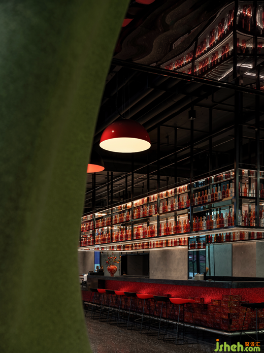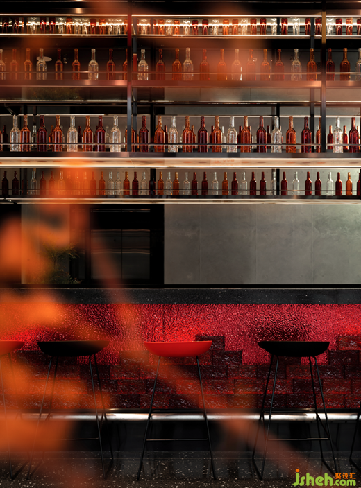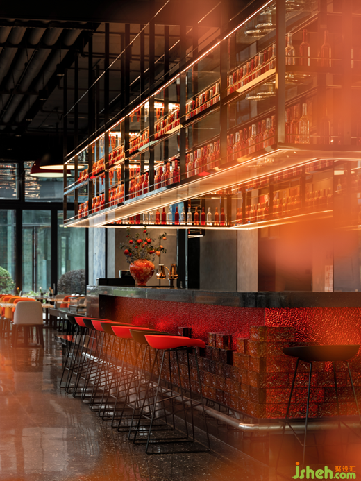 大堂空間節(jié)奏輕巧而緊湊,無(wú)縫銜接了前臺(tái)、接待區(qū)、酒吧和ADD餐廳。精品酒店設(shè)計(jì)律動(dòng)質(zhì)感的黑色鏡面天花豐盈了空間的動(dòng)態(tài)層次,與之形成鮮明對(duì)比的水磨石地面訴說(shuō)著城市的歷史。