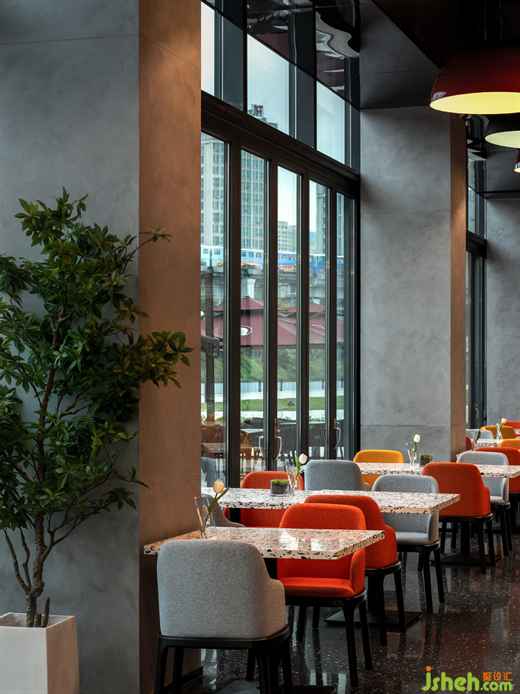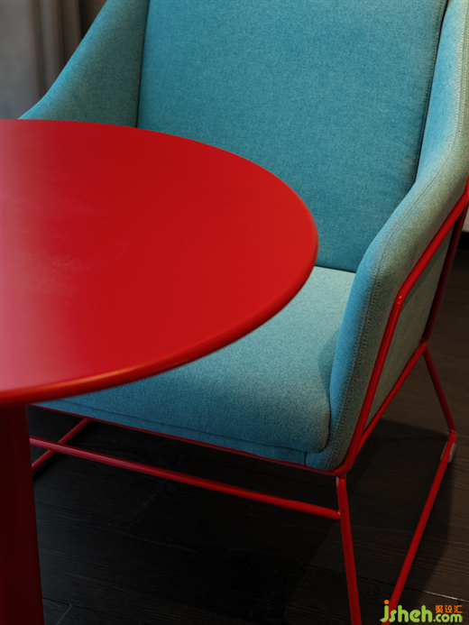 餐廳內(nèi)放置了水藍(lán)色的玻尿酸主題藝術(shù)畫,精品酒店設(shè)計(jì)為空間注入了層次之美,紅色、灰色座椅與水磨石桌面重疊交錯(cuò),輝映著光線的維度。若隱若現(xiàn)的窗外景色,為用餐空間帶來斷續(xù)的節(jié)律感。