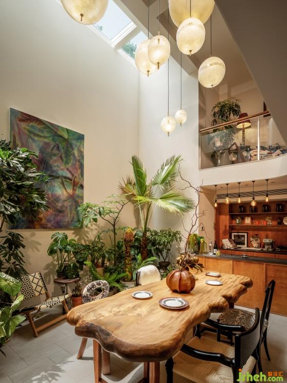 躍墅設(shè)計(jì)整個(gè)區(qū)域兼有野性的原始張力與復(fù)古的家居溫情。陽(yáng)光自通高屋面泄入,參差垂吊的球形吊燈再次拉伸了縱向空間。