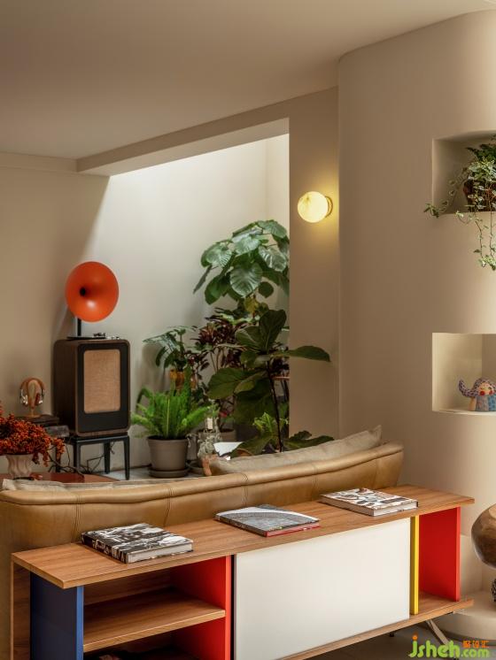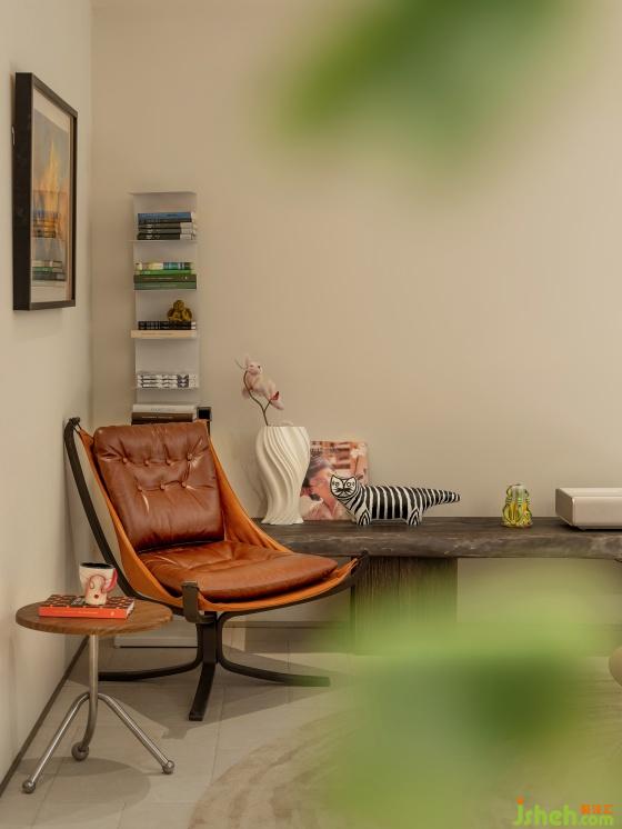 影音區(qū)緊鄰咖啡區(qū),雀躍的現(xiàn)代色彩與藝術(shù)品和自然肌理雜糅成一種顆粒度細(xì)膩的生活感,炙熱而飽含個(gè)性。