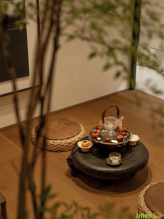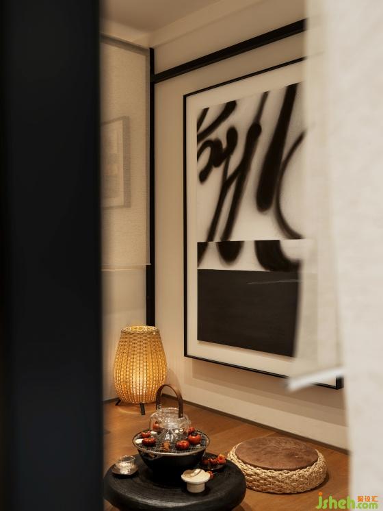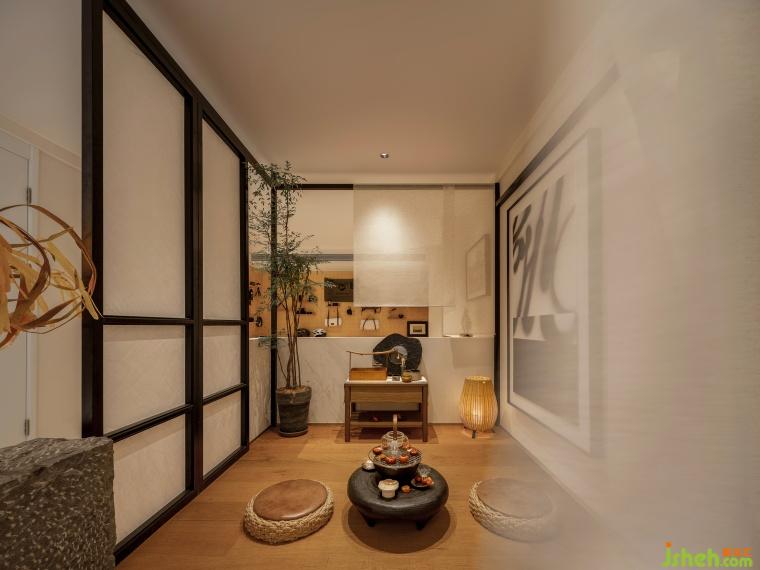 The tea room is a semi-open box at the center, akin to a tranquil tea room in a modern residence. Sliding doors and drapes provide options for openness or privacy. This area serves functional purposes while drawing the space toward the center, creating a cohesive whole.