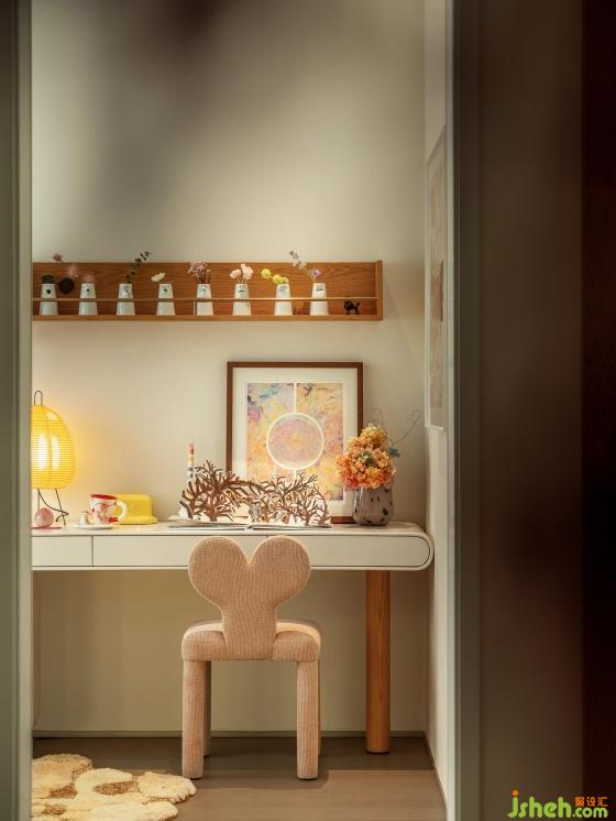 躍墅設(shè)計兒童房素雅潔凈,多功能家具讓有限的空間富于想象和探索感,無論是畫作還是手作地毯,藝術(shù)是一脈相承的線索,在家庭空間中與藝術(shù)品一種個人化的、長時間的、一對一的相遇,成為我們內(nèi)觀和觀看世界的雙向延伸,它令空間更趨于真實和個性化。
