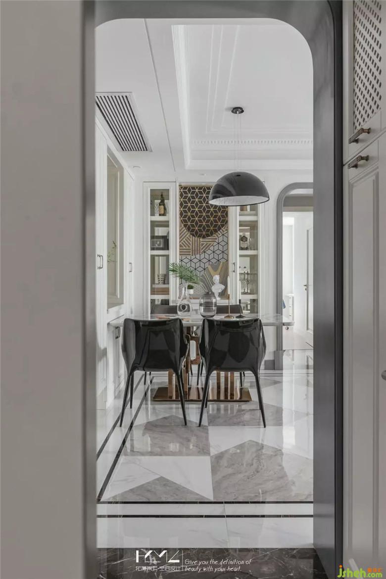 餐桌我們選用了六人位的長桌,桌面是白色紋理顯著的大理石,基座是古銅色金屬質(zhì)地,凸顯現(xiàn)代輕奢感。