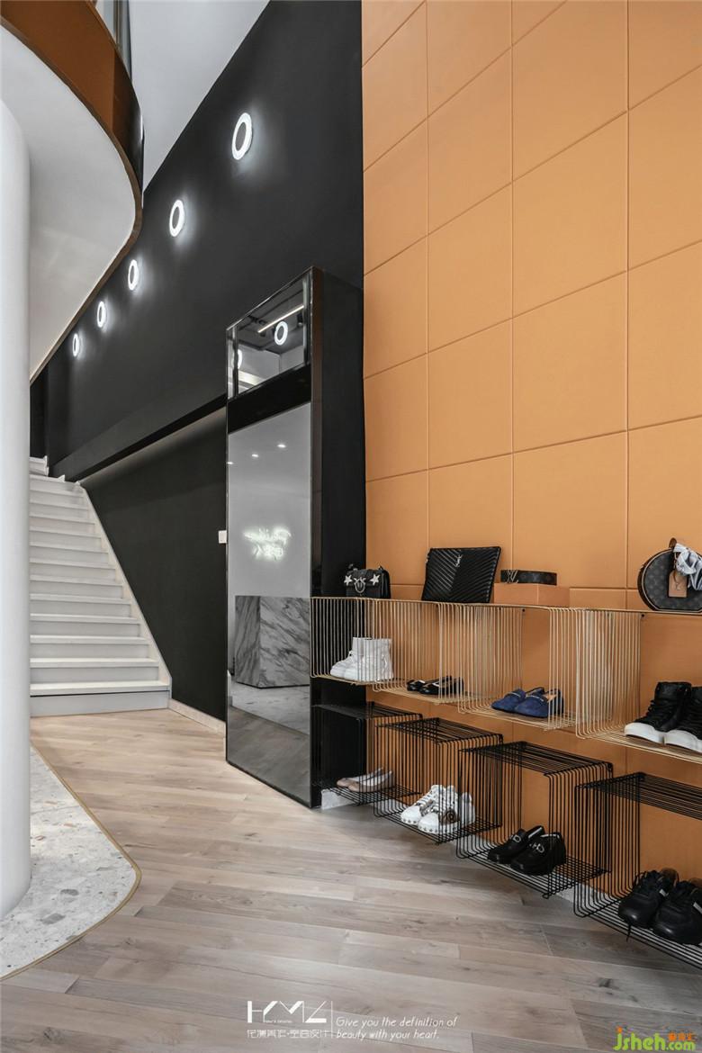 室內(nèi)空間并不大,挑高的結(jié)構(gòu),可以大大增加使用空間,但我們沒有完全將一二層一分為二,而是保證空間的整體感,局部架空,視覺上讓空間盡可能地高聳,而又能有著足夠的使用空間。入戶右手側(cè),整面橙色的硬包護(hù)墻,就是告訴我們的眼睛,空間的整體與高聳,同時(shí)也是定下整個(gè)設(shè)計(jì)的色彩基調(diào),華而優(yōu)雅。